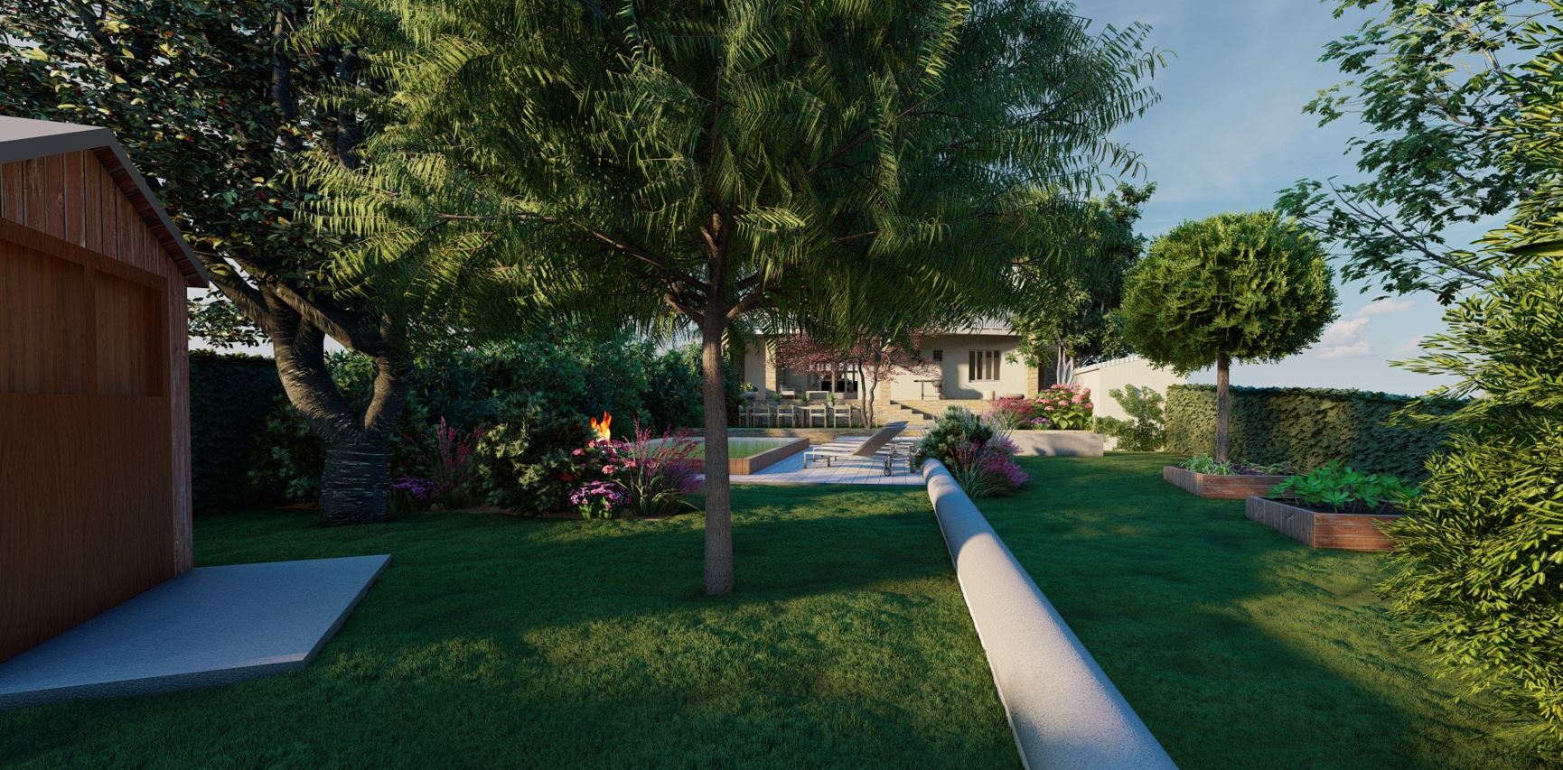 Aménagement d’un jardin en pente avec piscine et terrasses. Création d’un espace de rangement pour vélos.